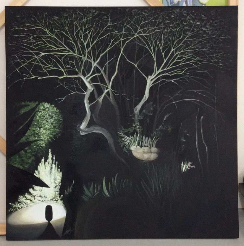 These three paintings are from her garden. In the first two, my goal was to capture the light: subtle and ethereal in Agave Americana, bold and brilliant in Flowering Agave. Barbara spotlighted her garden at night, presenting another fun challenge to paint.